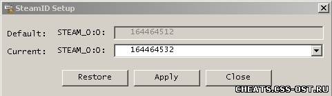 Вот вам наш старый добрый антибан Steam ID tool. Прост в использовании 1. Закинуть все файлы в папку с игрой (напиример D:/CSS/) 2.Зайти на сервер и получить бан ... 3.включить прогу steamid_tool.exe 4.Удаляем 1 цифру и ставим свою (например 5) Работает на всех ОС