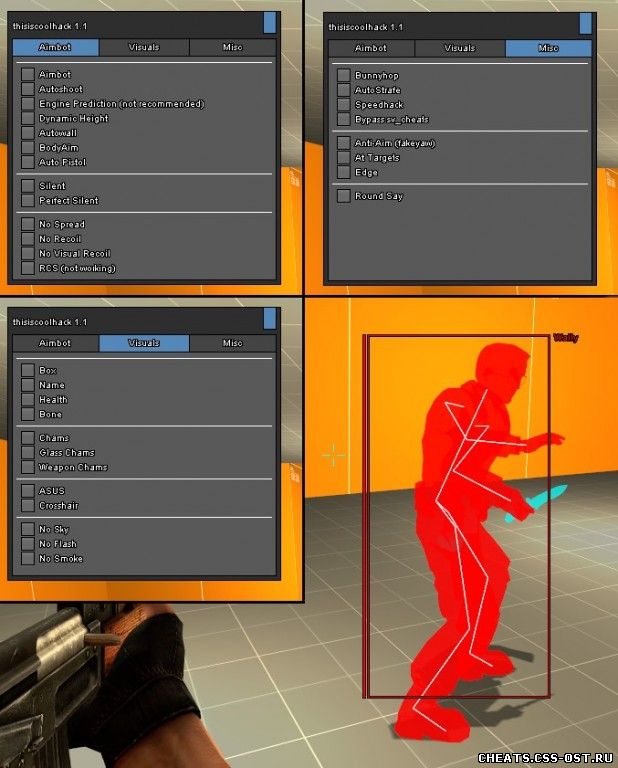 О чите: Удобнейший чит для cs source, собрал в себе наилучшие хаки как Aimbot, wallhaсk и BonnyHop. Лучше использовать для оттачивания рефлексов, а не тупо для мочилова до бана.