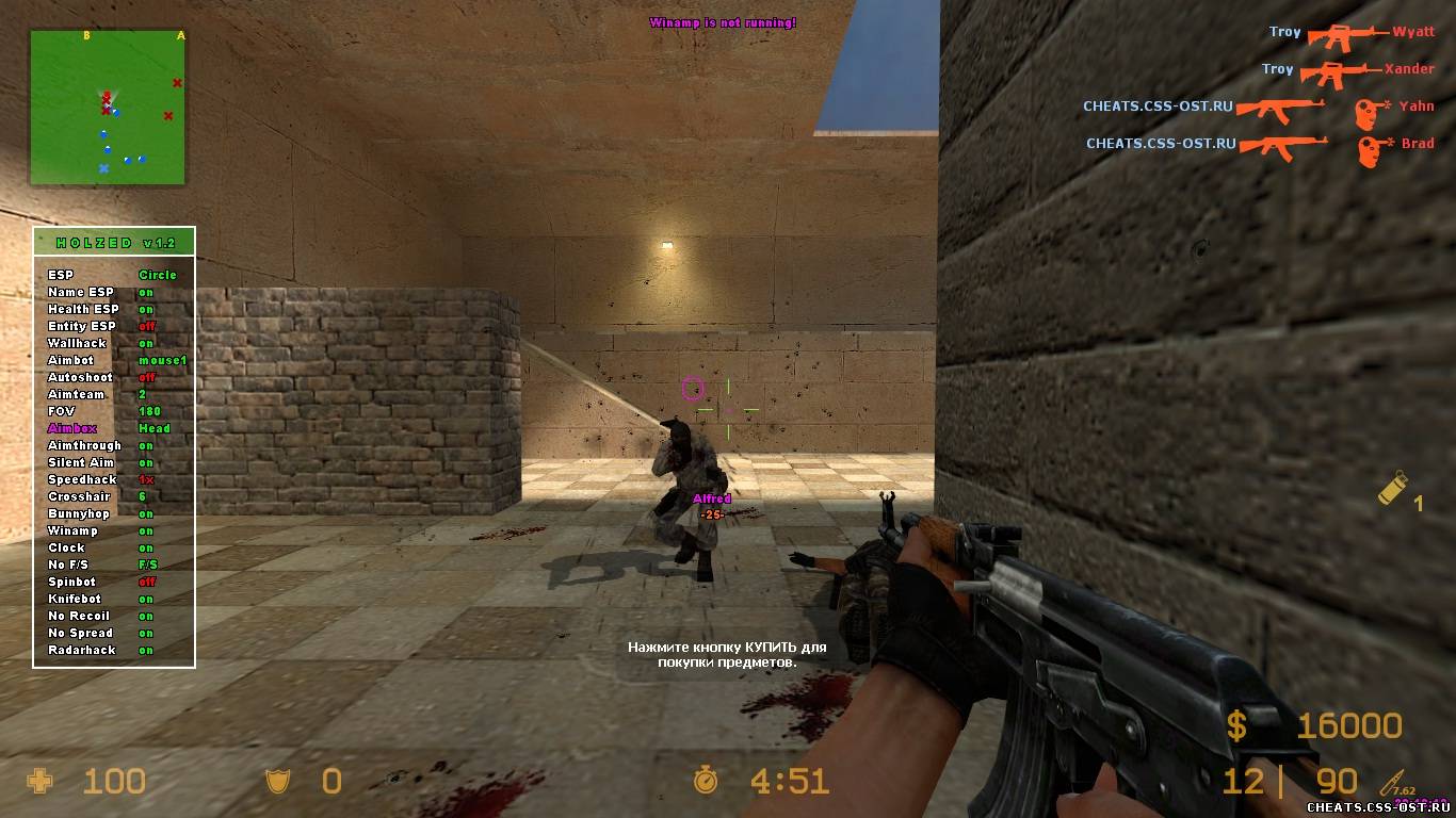 Описание: Довольно неплохой чит для Counter Strike Source v34. Чит запускаеться одной кнопкой - Insert, после чего на экран выводиться довольно простое меню (смотрим скриншот). Лично мне чит понравился и вам рекомендую.