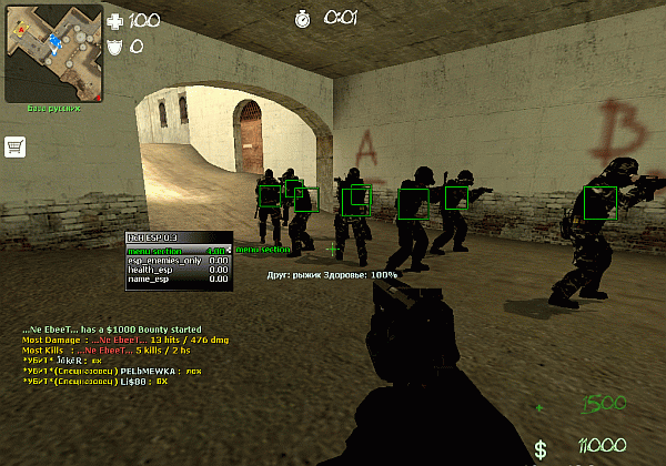 Простенький и беспалевый чит helperprogram для css. У чита css есть меню, которое активируется в игре кнопкой insert. Кнопка del это меню чита убирает. Навигация по меню чита кнопками-стрелками ВЛЕВО-ВВЕРХ-ВПРАВО-ВНИЗ. Как работет чит helperprogram можно посмотреть на скриншоте. Основное предназначение чита для css это то, что этот чит обозначает в "квадратные рамочки" противников и своих видно всех даже сквозь стены. Чит тестировался на v34 css