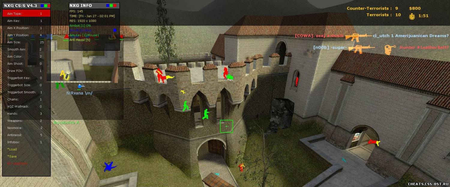 Тестил на Windows 7 64 bit Steam Функции чита NXG CSS PUBLIC V4.2: Chams - Возле игроков и оружия аура, т.е. они обведененны цветом.
