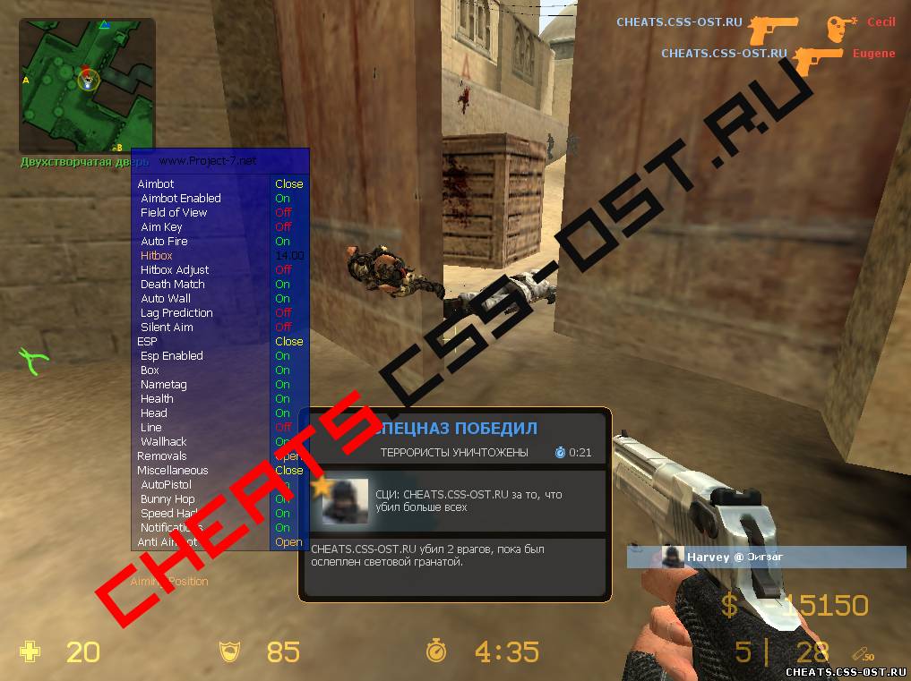 У нас вы сможете найти множество читов. Например читы для css v87 + 88. На данной странице вы найдете читы для css v87 + 88, а именно найдете P7 для css (aim + wallhack) для css, чтоб скачать чит P7 для css (aim + wallhack) для css бесплатно нажмите на кнопку выше.