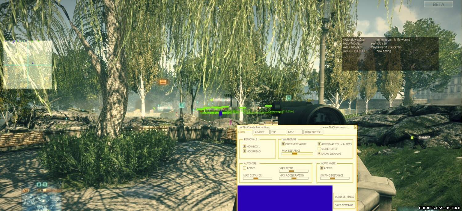 Функции чита: Aimbot: Smart Target Selection Frame Compensation Configurable Max Distance Configurable Aim Angle(limits the aimbots aim vectors) Configurable Prediction Limit Configurable Aim Bones ESP: Show player names Show player health Configurable Team Colors(visible, not visible) Configurable Enemy Colors(visible, not visible) Boxes: Player Boxes Custom Health Bar Configurable for Team and/or Enemy 2D Radar: Shows all players/vehicles Configurable Colors Configurable Zoom/Scale Factor Crosshair: Cross Configurable Color Configurable Size Configurable Structure Warnings: Proximity Alert Configurable Distance Aiming At Your Warnings Configurable for Visible / NotVisible Targets Show Player Weapon Auto Knife: Will knife players automatically Configurable Distance Auto Fire: Will fire at players following a strict set of rules, hit guaranteed Configurable target max speed Configurable target max acceleration Configurable max distance