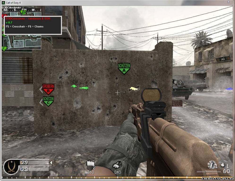 Инструкция: 1. Запустить D3DCrossover 0.7.exe 2. Включить COD4 3. Играть Горячие клавиши: INS: Меню F5: Crosshair вкл/выкл F6: Chams вкл/выкл