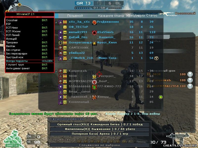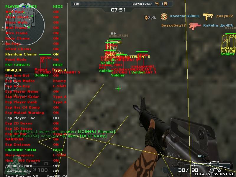 OneHit CF [на русском языке] — обновление чита. исправлено несколько багов,Среди функций чита можно заменять оружие как огнестрельное так и холодное. М16 и нож. Также можно в любой момент стать невидимкой и прикрутить оптику как у авм к любой пухе. В чите большое количество функций в удобном меню и на русском языке! Играйте и наслаждайтесь!