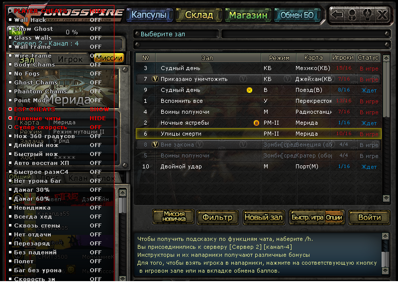 Инструкция по запуску: 1) Качаем, разархивироваем архив. 2) Запускаем чит от им. Администратора 3) Ждём активации чита. 4) Запускаем CrossFire 5) Заходим в склад и ВКЛ нужные функций. 6) Закрываем меню. (Если опять откроете меню то игра закроется) 7) Играем.