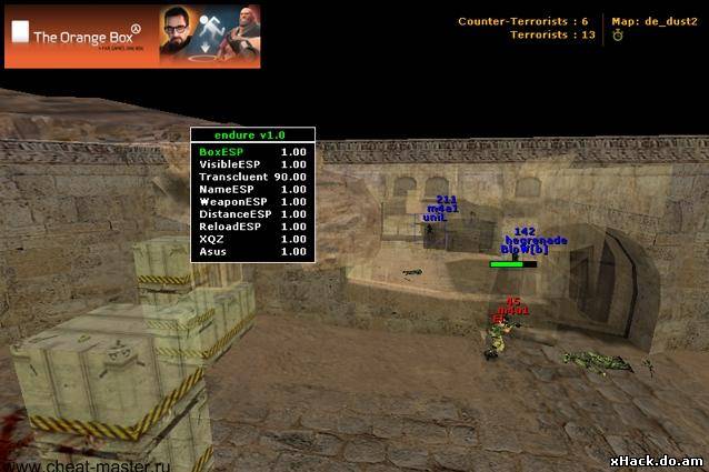 | Функции: EnemyESP (видеть через предметы), Panickey (Быстро выключить чит) (DELETE). Установка: - Не переименовывайте endure.dll - Распакуйте .EXE и .DLL в одну папку Запуск: - Запустите endure.exe - Запустите CS1.6 или CS:CZ - Войдите в игру - Играйте