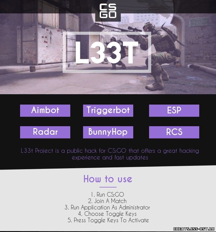 У нас вы сможете найти множество читов. Например читы для cs go. На данной странице вы найдете читы для cs go, а именно найдете L33t для CS GO, чтоб скачать чит L33t для CS GO бесплатно нажмите на кнопку выше.
