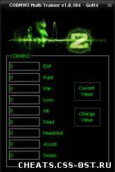 Игра: Modern Warfare 2 Версия игры: 1.0.184 VAC2:Undetected Функции: Редактирование статистики Установка: Запустить игру, затем Multi Trainer 1.0.184.exe. Выбираем что вам нужно изменить и закрываем программу. Заходим на сервер и играет карту до конца.