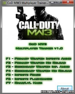 F1 - Бесконечные патроны для Основной оружии F2 - Огонь без перезарядки для Основной оружии F3 - Бесконечные патроны для Дополнительной оружии F4 - Огонь без перезарядки для Дополнительной оружии F5 - Бесконечные гранаты F6 - Бесконечные глушилки F7 - Взлом Ранга/ЛВЛ