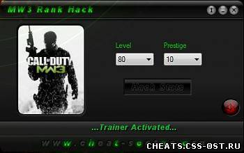 Инструкция: -Запустить ранг хак от имени администратора -Запустить MW3 и остаться в холе -Нажмите сочетание клавиш CTRL + ESC, чтобы свернуть игру -Выбрать нужное и нажмите на "Hack Stats" =Теперь закройте Hack-Rank. -Возвращаемся в игру и нужно сыграть несколько раундов. -Готово.