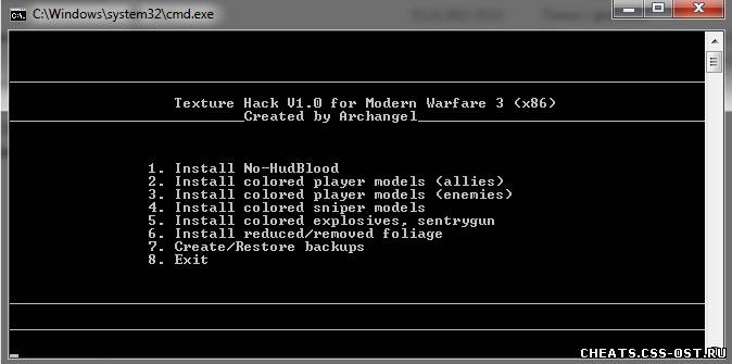 Инструкция: Распокавать архив 32 или 64bit, в зависимости от вашей системы, в основную папку игры (Если у вас 32bit C:\Program Files\Steam\steamapps\common\call of duty modern warfare 3\main) (Если у вас 64bit C:\Program Files (x86)\Steam\steamapps\common\call of duty modern warfare 3\main) Перейти в папку main и запустить автоустановщик hack v1.0.bat Начните с создания резервных копий (рекомендую) Установить функции какие вы хотите Запустить игру и наслаждаться